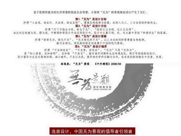中國(guó)快速城市化給設(shè)計(jì)師提供一生難求的機(jī)遇,可能是出于經(jīng)濟(jì)等原因,很多設(shè)計(jì)師覺(jué)得只有大尺度、大項(xiàng)目才“有可為”。這本無(wú)可厚非,老子說(shuō): “大而無(wú)外,小而無(wú)內(nèi)”,我認(rèn)為所謂“大小”只是相對(duì)而言, “小”也可“有為”。但是恰恰是小尺度才能與人的尺度相關(guān),真正反映出是否做到“以人為本”。外灘踩踏事件也在警醒設(shè)計(jì)師,中國(guó)城市化發(fā)展到了今天,我們從不缺乏的絢麗的設(shè)計(jì)理念,而是腳踏實(shí)地的實(shí)實(shí)在在的實(shí)施,哪怕是小小的人性化設(shè)施,關(guān)注真正意義上的“以人為本”,關(guān)注“細(xì)節(jié)設(shè)計(jì)”,正所謂千里之堤,潰于蟻穴。這就是選泉設(shè)計(jì)所倡導(dǎo)的“小而美、小而精”,關(guān)注細(xì)節(jié)并做到極致。