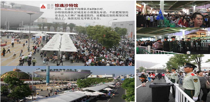 反觀,我們主持的上海世博會(huì)公共空間可以作為一個(gè)參考,作為一次有預(yù)謀的“高密度”事件,設(shè)計(jì)從一開(kāi)始就關(guān)注到高密度人流對(duì)場(chǎng)地設(shè)計(jì)的影響,世博前期做過(guò)人流分布的計(jì)算機(jī)模擬,對(duì)每個(gè)地塊出入口寬度根據(jù)人流測(cè)試確定跨寬度,設(shè)計(jì)以功能為導(dǎo)向,在規(guī)劃初期就對(duì)人流進(jìn)行測(cè)算,結(jié)論是在一平方米中能容納的極限是4.6人,設(shè)計(jì)考慮到到80萬(wàn)/天的極端高密度人流(事實(shí)是出現(xiàn)了103萬(wàn)人流高峰)。因此在場(chǎng)地設(shè)計(jì)中要求外部場(chǎng)地空間設(shè)計(jì)基本以平地為主,幾乎不設(shè)臺(tái)階,也不設(shè)任何水體,場(chǎng)地上的許多配套設(shè)施如坐凳、遮蔭、舞臺(tái)、廁所等盡量采取可移動(dòng)和可快速裝卸的特點(diǎn)。針對(duì)極端高密度人流與高溫天氣,在非餐飲高峰時(shí)段開(kāi)放餐廳,讓人就坐避暑;地塊間楔形綠地不種灌木,便于人流應(yīng)急疏散和通風(fēng)。