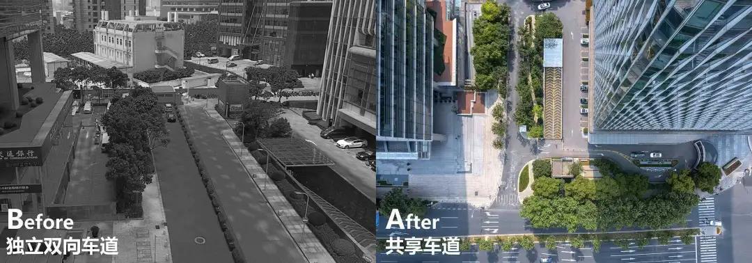 ▼改造后位于太平金融大廈及金磚大廈之間的共享車道©選泉設(shè)計