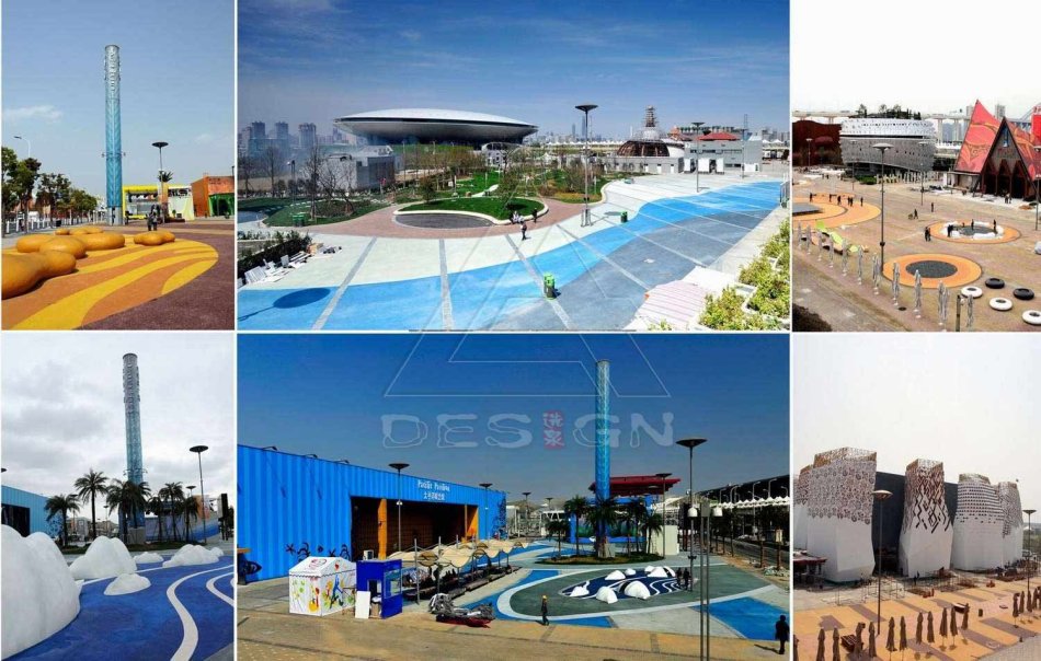 ???? 廣場(chǎng)系統(tǒng)設(shè)計(jì)整體上以網(wǎng)格的形式吻合城市肌理,形成方正、秩序的空間結(jié)構(gòu)和明確的方向感,適應(yīng)世博會(huì)高密度人流。其中,文化主題的演繹集中在五個(gè)主題廣場(chǎng):亞洲、大洋洲、歐洲、美洲和非洲。由于每個(gè)人對(duì)文化的理解不同,同時(shí)從抽象的文化理念到景觀的空間載體的表達(dá)更具有難度。最終通過文獻(xiàn)、問卷等途徑,確定選取自然環(huán)境元素與空間的文化意向元素來表達(dá)五大洲文化,提取“大洲的性格、自然環(huán)境、材料與植物、色彩”這5大元素進(jìn)行空間載體表達(dá)。亞洲廣場(chǎng)用“水墨”元素形成黑白灰空間,用“竹陣、竹傘”構(gòu)成內(nèi)斂含蓄的東方空間體驗(yàn);大洋洲廣場(chǎng)讓自由曲線形成“海洋島嶼”,描繪出一幅溫婉寧靜的土地畫面;歐洲廣場(chǎng)提取了擁有歐洲客廳之稱的“圣馬可廣場(chǎng)”線條形成秩序嚴(yán)謹(jǐn)?shù)目臻g感受;美洲廣場(chǎng)上生長(zhǎng)出熱帶雨林里的蒼天大樹,這抹濃綠與自由包容的文化共生;非洲廣場(chǎng)以“撒哈拉之眼”和“沙漠綠洲”為元素,用黃色和斑紋與的非洲館立面呼應(yīng),釋放出熱情奔放。