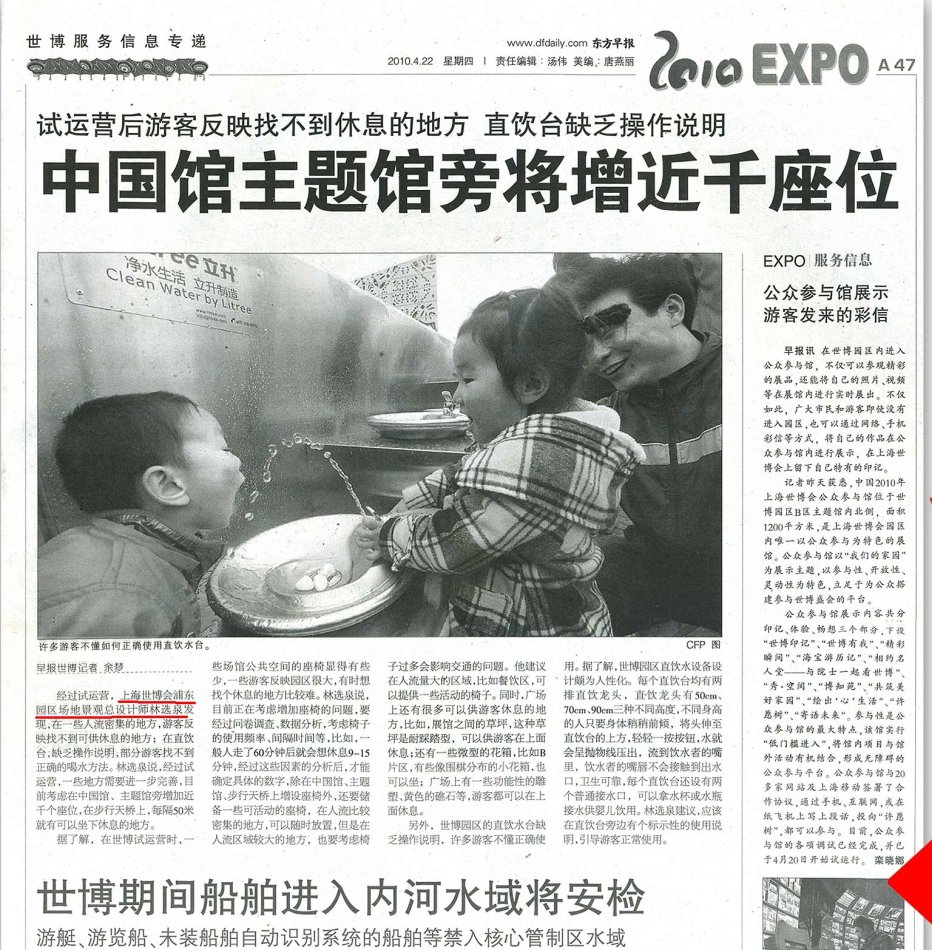????林選泉在昨日試運營調(diào)研中發(fā)現(xiàn),許多游客并不知道世博園區(qū)內(nèi)可以使用直飲水。每個直飲臺均有兩排直飲龍頭,每排各有5個出水口,直飲龍頭有50厘米、70厘米、90厘米三種不同高度,不同高度的人只要身體稍稍前傾,將頭伸至直飲臺的上方,輕輕一按按鈕,水就會呈拋物線壓出,流到飲水者的嘴里。每個直飲臺還設(shè)有兩個普通接水口,可以拿水杯或水瓶接水供嬰兒或殘障人士飲用。
