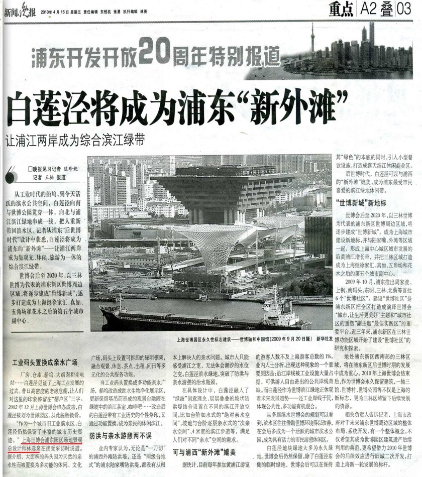 ????從工業(yè)時(shí)代的船塢,到今天活躍的濱水公共空間,白蓮涇向南與世博公園貫穿一體,向北與浦江濱江綠地串成一線,把人重新帶回濱水區(qū)。記者從浦東“后世博時(shí)代”設(shè)計(jì)中獲悉,白蓮涇將成為浦東的“新外灘”——讓浦江兩岸成為集觀光、休閑、旅游為一體的綜合濱江綠帶。