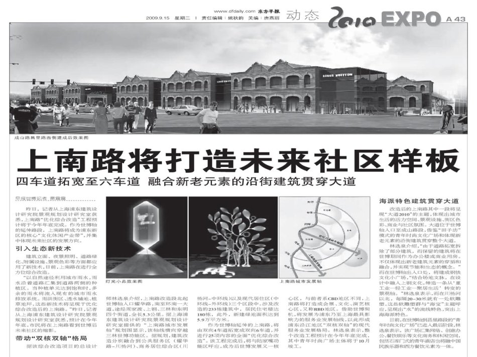 作為世博軸延伸的上南路,將由雙向4車道拓寬成雙向6車道,并進行25項內(nèi)容的全面“優(yōu)化綜合改造”。該工程完成后,將與陸家嘴功能區(qū)呼應(yīng),成為后世博發(fā)展又一核心區(qū),與前者系CBD地區(qū)不同,上南路將打造成會展、文化、演藝核心區(qū),又稱RBD地區(qū)。借助世博契機,將發(fā)展為浦東乃至上海最具影響力的服務(wù)業(yè)發(fā)展軸線,以此形成浦東沿江地區(qū)“雙核雙軸”的現(xiàn)代服務(wù)業(yè)發(fā)展格局。林選泉表示,整個改造工程預(yù)計在今年年底完成,其中青年時尚廣場主體將于10月竣工。