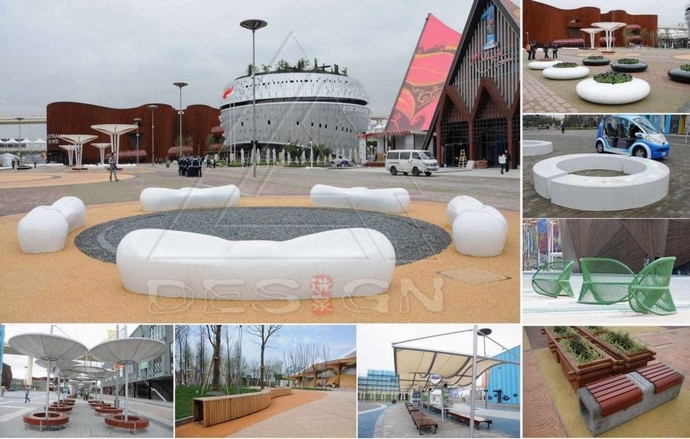 世博場(chǎng)地的坐凳,主要選擇再生木和竹板,分為固定式和可移動(dòng)式兩類。